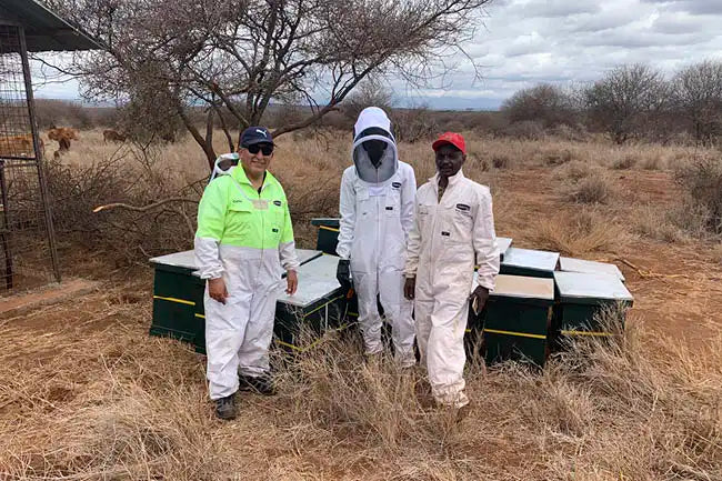 In October 2020, Head of Comvita Apiaries Carlos Zevallos, travelled to the Kimana region in Kenya to share his 35 years of beekeeping knowledge. Carlos is pictured here with local Maasai peole who will care for the bees over the coming seasons.